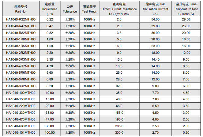 电流特性:饱和电流与温升电流随电感量增加呈梯度下降,例如 0.22μH 型号(HA1040-R22MTH00)饱和电流 54A,而 100μH 型号(HA1040-101MTH00)饱和电流降至 2.7A,符合 “电感量越大,电流承载能力越低” 的物理规律。
