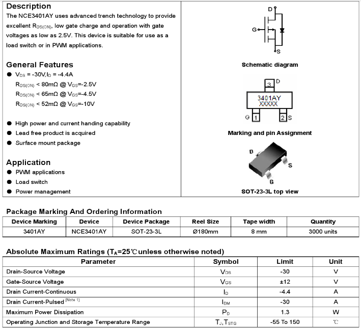 锂电池保护板一般选用30VMOS管,在这里给大家介绍下新洁能的增强型P沟道MOS管:NCE3401AY那么为何选用新洁能的NCE3401AY呢?南宫电子给大家分享下NCE3401AY的规格书,顺带给大家解答: